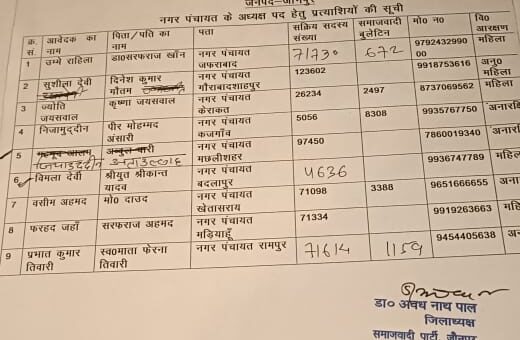 Politics जौनपुर सपा ने नगर पालिका परिषद के 3 व 9 नगर पंचायत प्रत्याशियों का सूची किया जारी 3 years ago C Bharat
