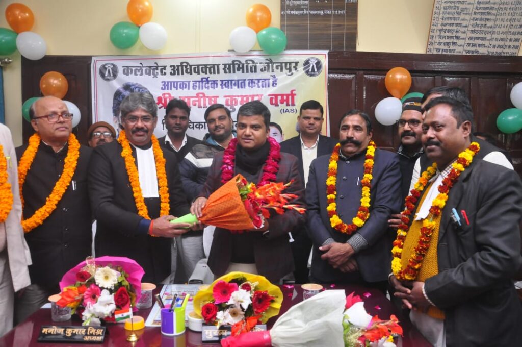 कलेक्ट्रेट अधिवक्ता संघ भवन में जिलाधिकारी मनीष कुमार वर्मा के द्वारा नव निर्वाचित कलेक्ट्रेट बार के पदाधिकारियों का सम्मान किया गया