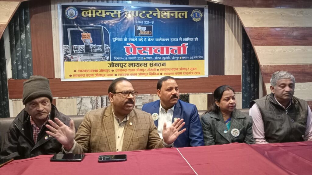 इलेक्ट्रिकल उपकरणों के गैर वैज्ञानिक निस्तारण से हानिकारक हैवी मैटल्स और अन्य प्रदूषक एवं रासायनिक तत्व पर्यावरण को दूषित करते हैं। यह गंभीर रोगों का एक कारण भी बन सकता है। ई-वेस्ट का निस्तारण वैज्ञानिक तरीके से रिसाइकलर से ही किया जाना चाहिए ना कि कबाड़ी द्वारा। आगे उन्होंने बताया कि इस अभियान के तहत ई-वेस्ट के संबंध में जानकारी प्रदान करने के लिए विभिन्न माध्यम से जन-जागरुकता फैलाई जाएगी। शहर में 19 जनवरी को शाही किला से ई-वेस्ट रैली निकाली जायेगी तथा शहर में जगह-जगह पर इलेक्ट्रोनिक वेस्ट संग्रहण के लिए केन्द्र स्थापित किये गए हैं। जिसमें गोल्डेन हार्ड वेयर सदर अस्पताल के सामने, सुपर टाइम्स किला गेट, आर. एन. काम्प्लेक्स निकट जेसीज चौराहा, राज ज्वेलर्स अहियापुर मोड़, माँ विध्यवासिनी पावर एजेंसी मछली मार्केट के सामने कचहरी रोड, शाहगंज एवं केजी डायग्नोस्टिक सेन्टर निकट होटल रिवर व्यू, मौर्या कटरा रुहट्टा, गणेश प्लाईवुड मुमताज कटरा कोतवाली चौराहा, पल्लवी स्टूडियो पालिटेक्निक चौराहा पर कलेक्शन सेंटर बनाये गये हैं, जहाँ पर कोई भी ई वेस्ट मटेरियल समय प्रातः 11 बजे से सांय 5 बजे दे सकता है । इसके पूर्व लायन्स मेन अध्यक्ष संदीप गुप्ता, लायन्स सूरज अध्यक्ष आनन्द स्वरूप, लायन्स क्षितिज अध्यक्ष विष्णु सहाय, लायन्स गोमती सचिव सैय्यद कमर हसनैन दीपू, लायन्स पवन अध्यक्ष विनय कुमार मौर्य ने अतिथियों का स्वागत किया। इस अवसर पर रीजन चेयरमैन अशोक मौर्य, जोन चेयरपर्सन प्रतिमा गुप्ता, संतोष साहू बच्चा, सैय्यद मोहम्मद मुस्तफा, मनीष गुप्ता व लियो अध्यक्ष हर्षित रंजन, राजीव श्रीवास्तव, डा राजेश मौर्य, शशांक सिंह रानू, राजेन्द्र खत्री, अजीत सोनकर आदि उपस्थित रहे।