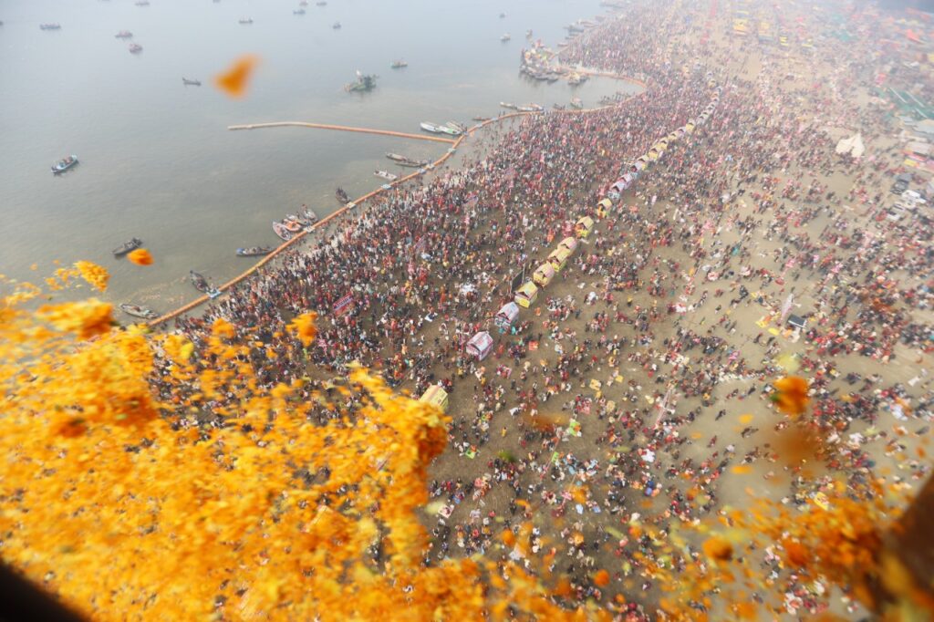हेलीकॉप्टर से पुष्प वर्षा कर हुआ कल्पवासियों, श्रद्धालुओं का स्वागत