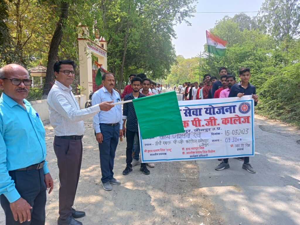 गांधी स्मारक पीजी कॉलेज समोधपुर जौनपुर के राष्ट्रीय सेवा योजना के विशेष शिविर के छठवें दिन ‘स्वास्थ्य जागरूकता रैली’ निकालकर अभिगृहीत दलित बस्ती, जमौली के ग्रामवासियों को स्वास्थ्य के प्रति जागरूक किया । इस रैली को हरी झंडी दिखाकर डॉ पंकज सिंह, विभागाध्यक्ष, बीएड, गांधी स्मारक पीजी कॉलेज समोधपुर जौनपुर ने गंतव्य स्थल की ओर रवाना किया । रैली के बाद स्वयंसेवक एवं स्वयंसेविकाओं ने भोजन एवं विश्राम किया। शिविर के दूसरे सत्र में बौद्धिक एवं सांस्कृतिक कार्यक्रम का आयोजन किया गया । बौद्धिक सत्र का शुभारंभ डॉ लालमणि प्रजापति, असिस्टेंट प्रोफेसर, बीएड, गांधी स्मारक पीजी कॉलेज समोधपुर जौनपुर ने मां सरस्वती की प्रतिमा पर माल्यार्पण और दीप प्रज्वलित कर किया।स्वयंसेवक एवं स्वयंसेविकाओं ने दहेज प्रथा पर एकांकी प्रस्तुत किया ।मुख्य अतिथि के रुप में बोलते हुए डॉ लालमणि प्रजापति ने बताया कि स्वास्थ्य ही सबसे उत्तम धन है। स्वास्थ्य ही सभी धनों में प्रधान है। राष्ट्रीय सेवा योजना को व्यक्तित्व विकास के लिए आवश्यक बताया ।उन्होंने आगे बताया कि समाज में स्वयं को स्थापित करने के लिए पाठ्य सहगामी क्रियाओं के साथ साथ राष्ट्रीय सेवा योजना का महत्वपूर्ण योगदान है । विशिष्ट अतिथि जितेंद्र सिंह ने स्वयंसेवक एवं स्वयंसेविकाओं को स्वास्थ्य का महत्व बताया साथ ही यह भी कहा कि ‘स्वास्थ्य ही धन है’।कार्यक्रम का संचालन वरिष्ठ कार्यक्रम अधिकारी डॉ इंद्र बहादुर सिंह तथा धन्यवाद ज्ञापन कार्यक्रम अधिकारी डॉ आलोक प्रताप सिंह विशेन ने किया ।