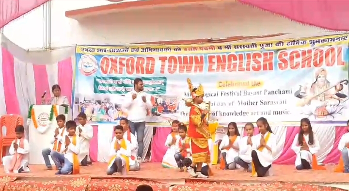 विकास खंड मछलीशहर के बंधवा बाजार स्थित आक्सफोर्ड टाउन इंग्लिश मीडियम स्कूल में बुधवार को बसंत पंचमी के अवसर विद्यालय परिसर में मां सरस्वती का पूजन विद्यालय के शिक्षकों और बच्चों द्वारा किया गया। कार्यक्रम के आरम्भ में मां सरस्वती के चित्र पर माल्यार्पण कर दीप प्रज्ज्वलित किया गया तत्पश्चात छठवीं कक्षा के बच्चों ने सरस्वती वंदना पर नृत्य किया। कक्षा चार के बच्चों ने कीजौ केशरी के लाल मेरा छोटा सा यह काम, मेरे राम जी से कह देना जै सियाराम….. के गाने पर नृत्य किया।यू के जी की बच्चों ने आज गली-गली अवध सजायेंगे, आज पग-पग पलक बिछायेंगे…. गीत पर नृत्य किया। कक्षा सात की लड़कियों ने नारी सशक्तिकरण के गाने पर नृत्य प्रस्तुत किया। नर्सरी क्लास के बच्चों ने जनम जनम की खोज बताये,राम से चलकर राम पे आये…. गीत पर नृत्य किया। कक्षा आठ के बच्चों ने युग राम राज का आ गया…गीत पर नृत्य किया।कार्यक्रम के समापन पर प्रतिभागियों को पुरस्कृत भी किया गया तथा प्रसाद वितरित किया गया। आज के इस कार्यक्रम में विद्यालय के प्रबंधक अनिल सिंह, प्रधानाचार्य विपिन मिश्रा, दिनेश सिंह, अंकिता सिंह, ऋचा सिंह,अमित तिवारी, स्वाति तिवारी, पूजा प्रजापति, आकांक्षा दूबे,नेहा मिश्रा, महिमा मसीह,मोनी सिंह, लक्ष्मी जयसवार,जय प्रकाश तिवारी,रंजू मिश्रा, जगदीश मसीह, संगीता मसीह आदि उपस्थित रहीं।