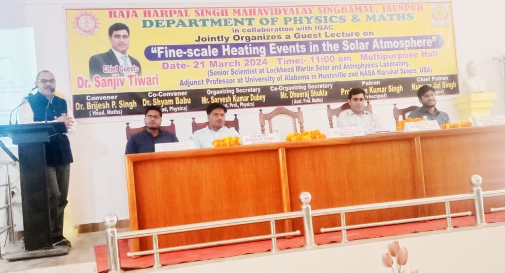स्थानीय। राजा हरपाल सिंह महाविद्यालय में गणित और भौतिक विज्ञान विभाग के संयुक्त तत्वावधान में आयोजित व्याख्यानमाला के अंतर्गत “सौर वायुमंडल में सूक्ष्म पैमाने पर तापन घटनाएँ” विषय पर एक संगोष्ठी का आयोजन किया गया। कार्यक्रम का शुभारम्भ दीप प्रज्वलन एवं आमंत्रित अतिथियों को स्मृति चिन्ह देकर सम्मानित करके किया गया। संगोष्ठी को सम्बोधित करते हुये नासा में वरिष्ठ वैज्ञानिक रहे और कार्यक्रम के मुख्य वक्ता डॉ० संजीव तिवारी ने सौर भौतिकी के मूल सिद्धांतों से विद्यार्थियों को परिचित कराते हुए बताया कि हिनोड, एसडीओ और सोलर ऑर्बिटर जैसे उन्नत सौर दूरबीनों के साथ हाल ही में किए गए शोध अध्ययनों से सौर वायुमंडल में अनेक सौर विशेषताओं एवं सूक्ष्म पैमाने पर विस्फोटक घटनाओं की उपस्थिति का खुलासा हुआ है। उन्होंने कहा कि सूक्ष्म पैमाने के तापन की घटनाओं में डॉट-लाइक, जेट-लाइक और लूप-लाइक घटनाएं, सनस्पॉट में डॉट्स एवं जेट, सौर वायुमंडल में कैम्पफायर आदि ऐसे क्षेत्र हैं जो वैज्ञानिक अनुसंधान के क्षेत्र में सौर भौतिकी में शोध की अनंत संभावनाएं और अवसर प्रदान करता है। इस अवसर मुख्य अतिथि का स्वागत करते हुए महाविद्यालय के प्राचार्य प्रोफेसर अरुण कुमार सिंह ने कहा कि हमारे लिए गर्व का विषय है कि हमारी पहुंच नासा तक है। कार्यक्रम का सफल संचालन भौतिक विज्ञान विभाग में असि० प्रोफेसर सर्वेश कुमार दुबे ने किया और आभार ज्ञापन भौतिक विज्ञान विभाग के अध्यक्ष डॉ० श्याम बाबू द्वारा किया गया। उक्त अवसर पर गणित विभाग के डॉ० बृजेश प्रताप सिंह एवं धीरज शुक्ला सहित महाविद्यालय के अन्य प्राध्यापक एवं बड़ी संख्या में छात्र और छात्राएं मौजूद रहे।