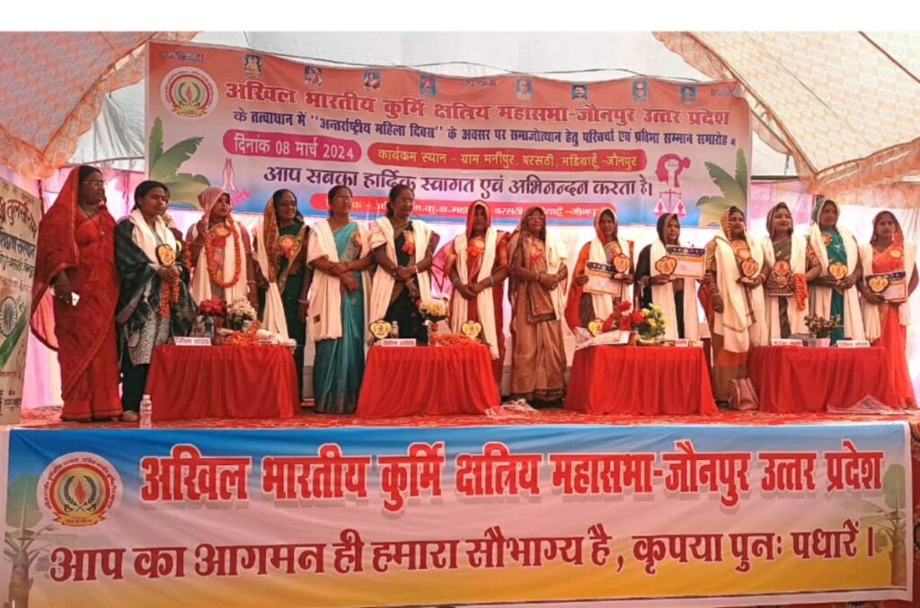 जौनपुर-जिले के बरसठी विकास खण्ड के अन्तर्गत मनीपुर गांव में अखिल भारतीय कुर्मी क्षत्रिय महासभा के तत्वाधान में अंतर्राष्ट्रीय महिला दिवस का कार्यक्रम समाज के उत्थान के लिये गोष्ठी एवं प्रतिभा सम्मान समारोह का आयोजन किया गया lकार्यक्रम का शुभारंभ राष्ट्रीय कबड्डी खिलाड़ी सुलेखा पटेल, सुनीता वर्मा,सोनी पटेल,सीमा देवी,संजू पटेल,अनीता पटेल सहित तमाम महिलाओं के द्वारा प्रथम शिक्षिका सावित्रीबाई फुले के चित्र पर दीप प्रज्ज्वलित कर अन्य महापुरुषों के चित्र पर माल्यार्पण करते हुए कुर्मी कुलध्वज फहराने के उपरांत कुर्मी कुल गीत से कार्यक्रम का शुभारंभ किया गया lकार्यक्रम के दौरान विश्व प्रसिद्ध जादूगर रामरथी सिंह पटेल के द्वारा महिलाओं के एकीकरण हेतु परिवार व समाज में व्याप्त हिंसा, कुरीति सहित अन्य विचारों को समाहित करते हुए जादू के माध्यम से संदेश दिया गया lतथा इस दौरान क्षेत्र के 25 महिला प्रधान, क्षेत्र पंचायत सदस्य, कोटेदार, खिलाड़ी, समाज सेवी, समूह सखी,हाई स्कूल व इण्टर में अच्छे अंक प्राप्त करने को अंग वस्त्र, मोमेंटो व प्रशस्ति पत्र देकर सम्मानित किया गया l महिलाओं के शिक्षा,चिकित्सा ,पारिवारिक कलह आदि विषयों पर प्रमुख रूप से नेहा पटेल ,साक्षी पटेल,दुर्गावती पटेल,गीता देवी, सुषमा पटेल आदि महिलाओं ने अपने-अपने विचार रखें l वक्ताओं ने कहा कि बच्चों को मोबाइल से दूरी बनाने हेतु विशेष प्रयास किया जाए, महिलाओं में होने वाले गंभीर बीमारी को छुपाएँ न उसकी चर्चा परिवार में करके हम अपना बचाव कर सकते हैं कार्यक्रम में