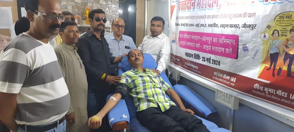 जौनपुर जिलाधिकारी रविन्द्र कुमार मांदड़ के निर्देशन में मतदान प्रतिशत बढ़ाने के लिए चल रही स्वीप गतिविधियों के तहत स्वीप कार्यक्रम के अन्तर्गत मतदाता जागरूकता के साथ मानवता की सेवा हेतु रक्तदान की अनूठी पहल की गई।