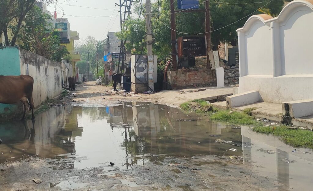 बोदकरपुर में नाली का गंदा पानी सड़क पर बहने से लोगो का चलना दूभर।