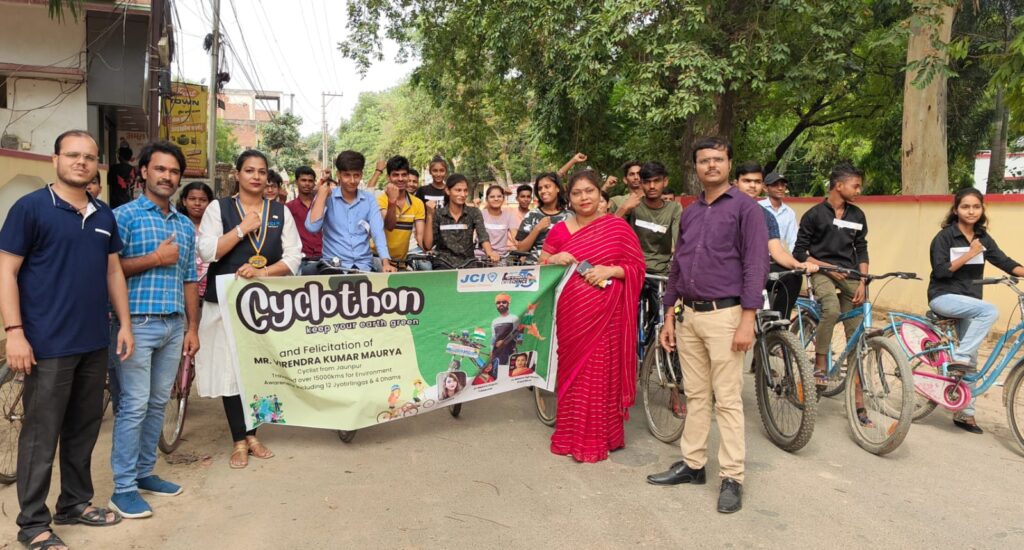 जेसीआई जौनपुर चेतना द्वारा जौनपुर में साइक्लोथैन का आयोजन करवाया गया जिसमें भारी संख्या में लोग उपस्थित रहे यह ब्लॉसम केयर क्लासेस के बच्चों द्वारा किया गया इस साइक्लोथैन में चीफ गेस्ट वीरेंद्र कुमार मौर्या उपस्थित रहे आपने हरी झंडी दिखाकर रेस को आरंभ किया। वीरेंद्र कुमार मौर्या ने यूपी, बिहार, झारखंड, पश्चिम बंगाल, उड़ीसा, तमिलनाडु, केरल, कन्याकुमारी, गोवा, महाराष्ट्र, गुजरात, राजस्थान, दिल्ली, हरियाणा, पंजाब, उत्तराखंड, 12 ज्योतिर्लिंग, आदि जगहों पर साइकिल द्वारा भ्रमण किया। साइकिल रेस में बच्चों को पहले जेसीआई का बैच लगाया गया और उन्हें दिशानिर्देश दिया गया तथा प्रथम द्वितीय और तृतीय पुरस्कार से अवार्ड देकर और मिठाई खिलाकर सम्मानित किया गया अन्य बच्चों को सर्टिफिकेट और मेडल से सम्मानित किया गया। तथा उन बच्चों को प्रोत्साहित किया गया इस कार्यक्रम का संचालन पूनम जायसवाल ने किया ।कार्यक्रम में शक्ति श्रीवास्तव, पवन श्रीवास्तव, विकास पाल, रितिक मौर्य, कविता राव, सुजीत निषाद, शशीकांत मौर्य, अशियम आदि उपस्थित रहे।