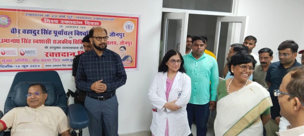 जौनपुर विश्व रक्तदाता दिवस एवं रक्तदाता के 20 वर्ष पूरे होने के अवसर पर उमानाथ सिंह स्वशासी राज्य चिकित्सा महाविद्यालय, जौनपुर एवं वीर बहादुर सिंह पूर्वांचल विश्व विद्यालय, जौनपुर के संयुक्त तत्वाधान में रक्तदान शिविर का आयोजन प्रधानाचार्य, प्रो0 शिवकुमार के दिशा निर्देश में कार्यक्रम का प्रबंधन डा0 आशुतोष सिंह, प्रभारी अधिकारी, ब्लड बैंक द्वारा उमानाथ सिंह स्वशासी राज्य चिकित्सा महाविद्यालय, जौनपुर के अस्पताल भवन में किया गया।
