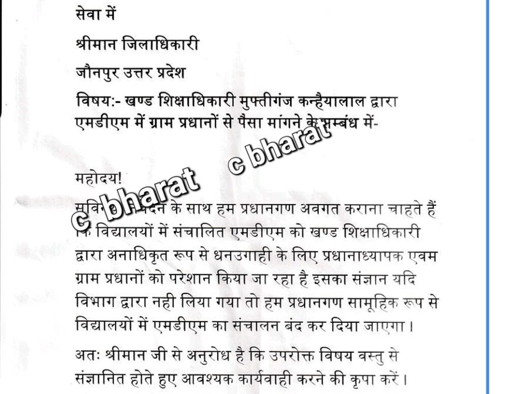 जौनपुर। मुफ्तीगंज क्षेत्र के खंड शिक्षा अधिकारी कन्हैयालाल पर विद्यालयों में संचालित एमडीएम (मिड डे मील) योजना के संचालन के लिए ग्राम प्रधानों से अवैध रूप से धन उगाही करने का गंभीर आरोप लगा है।