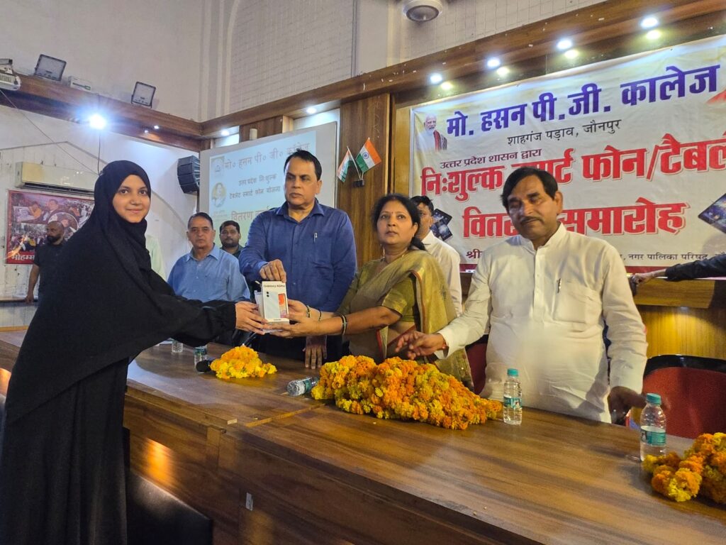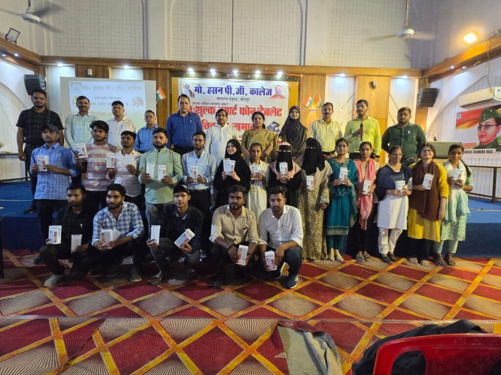 Jaunpur news उत्तर प्रदेश शासन के डिजिटल इंडिया मिशन के तहत सोमवार को मोहम्मद हसन पी.जी. कॉलेज, जौनपुर के सौदागर हाल में स्मार्टफोन एवं टैबलेट वितरण कार्यक्रम का भव्य आयोजन किया गया। कार्यक्रम की अध्यक्षता कॉलेज के प्राचार्य डॉ. अब्दुल कादिर खान ने की।