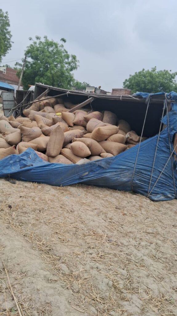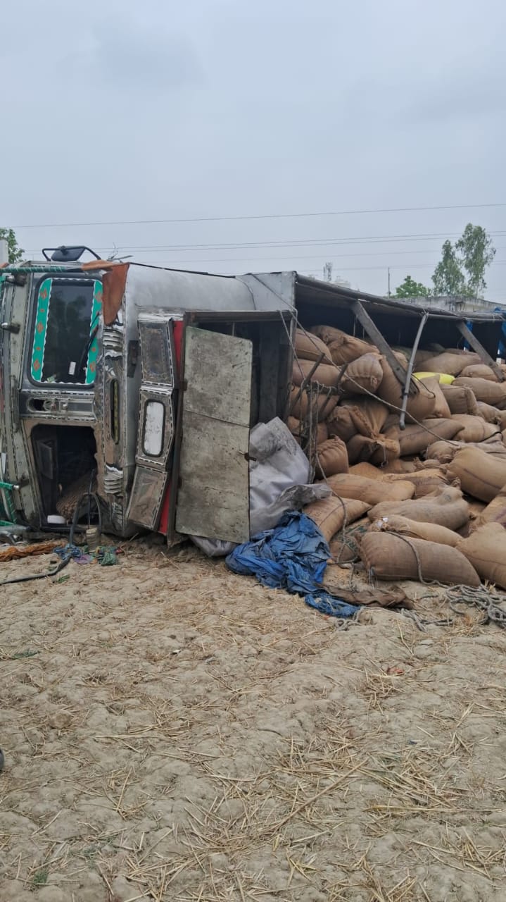 सूचना मिलते ही पुलिस मौके पर पहुंची और तत्परता दिखाते हुए ट्रक चालक को हिरासत में ले लिया। पुलिस ने गेहूं की सुरक्षा के लिए टीम तैनात कर दी है। मामले की जांच जारी है।