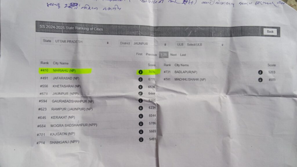 Jaunpur news जौनपुर।स्वच्छ भारत मिशन के तहत वर्ष 2024 की स्टेट रैंकिंग ऑफ सिटीज में मड़ियाहूं नगर पंचायत ने जिले में पहला स्थान प्राप्त कर इतिहास रच दिया है। नगर को कुल 10,000 अंकों में से 7076 अंक (70.76%) प्राप्त हुए, जिससे नगरवासियों में हर्ष और गर्व की लहर दौड़ गई।
