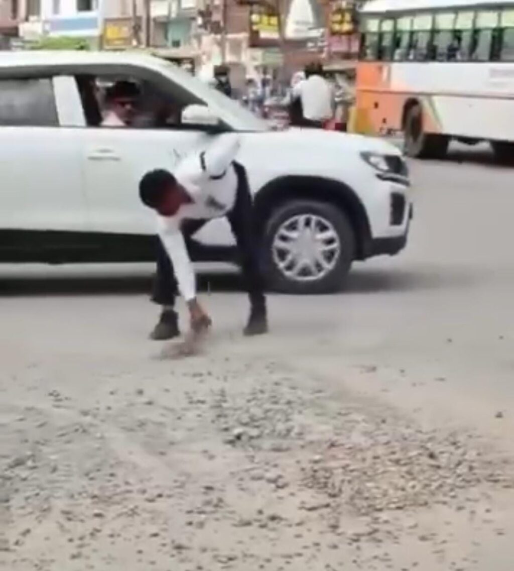 सड़क पर बिखरी गिट्टियों को देख ट्रैफिक सिपाही ने थामा झाड़ू, सफाई कर बने मिसाल