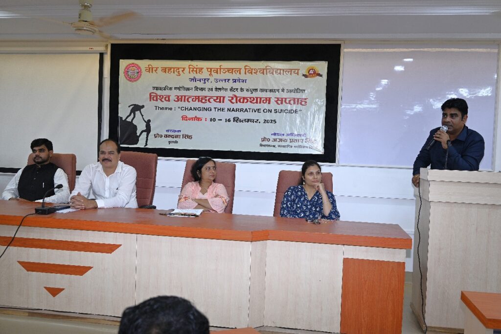 वीर बहादुर सिंह पूर्वांचल विश्वविद्यालय के संकाय भवन के कॉन्फ्रेंस हॉल में विश्व आत्महत्या रोकथाम सप्ताह के अंतर्गत सोमवार को सार्थक और विचारोत्तेजक पैनल डिस्कशन का आयोजन किया गया। इसका विषय था – “परिवार, मित्र और समाज की आत्महत्या रोकथाम में भूमिका।”