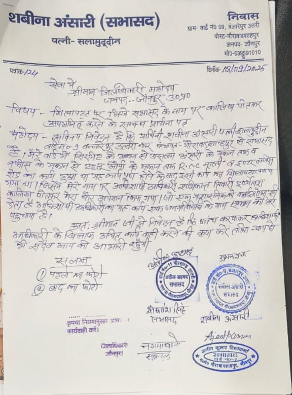 Jaunpur news महिला सभासद का आरोप: ईओ ने शिलापट्ट पर नाम पर पोटवाई कालिख, डीएम से की जांच की मांग