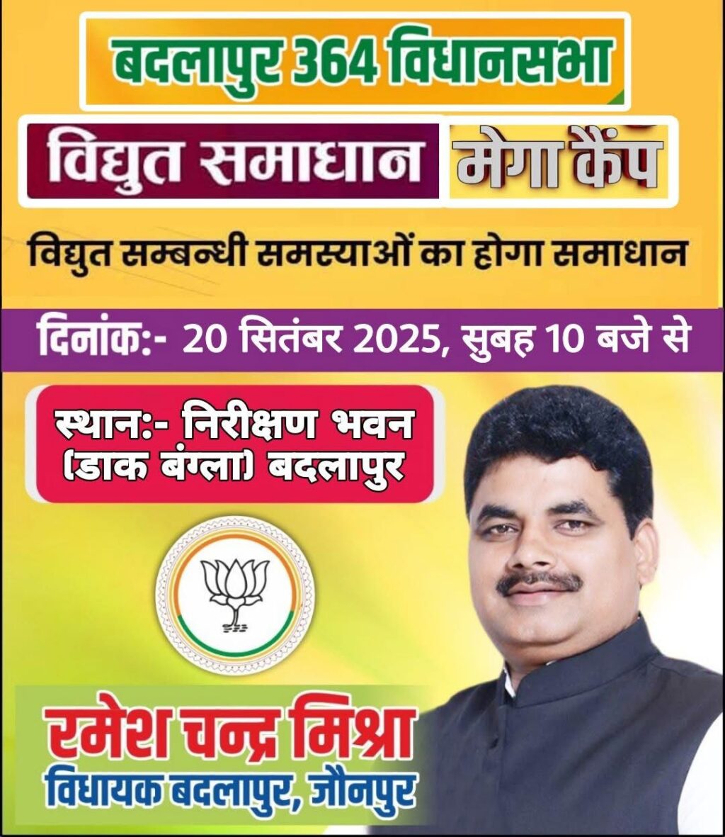 बदलापुर विधानसभा क्षेत्रवासियों की विद्युत समस्याओं के समाधान के लिए दिनांक 20 सितंबर 2025, दिन शनिवार को सुबह 10 बजे से निरीक्षण भवन (डाक बंगला) बदलापुर पर विद्युत समाधान कैंप आयोजित किया जाएगा।