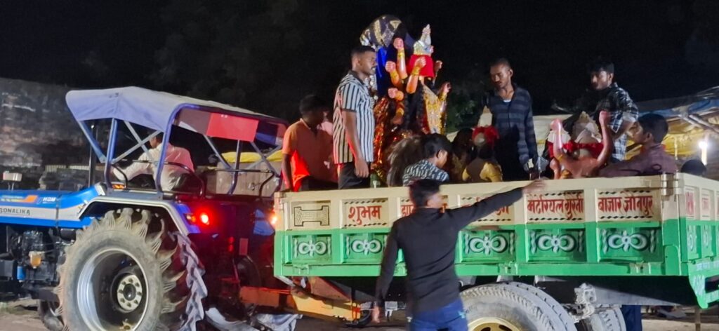 ट्रैक्टर पर डीजे साउंड के साथ माता की प्रतिमा ले जाने के लिए सुबह से ही भक्तों भीड़ उमड़ी हुई थी।