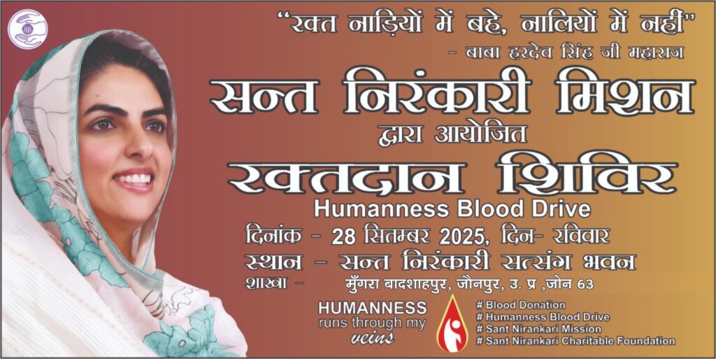 संत निरंकारी मिशन के तत्वावधान में रविवार, 28 सितंबर 2025 को मुंगराबादशाहपुर के प्रतापगढ़ रोड शिवम मैरिज हॉल के पास स्थित संत निरंकारी सत्संग भवन ब्रांच में रक्तदान शिविर का आयोजन किया जा रहा है। शिविर का समय प्रातः 10:00 बजे से दोपहर 2:00 बजे तक रहेगा।
