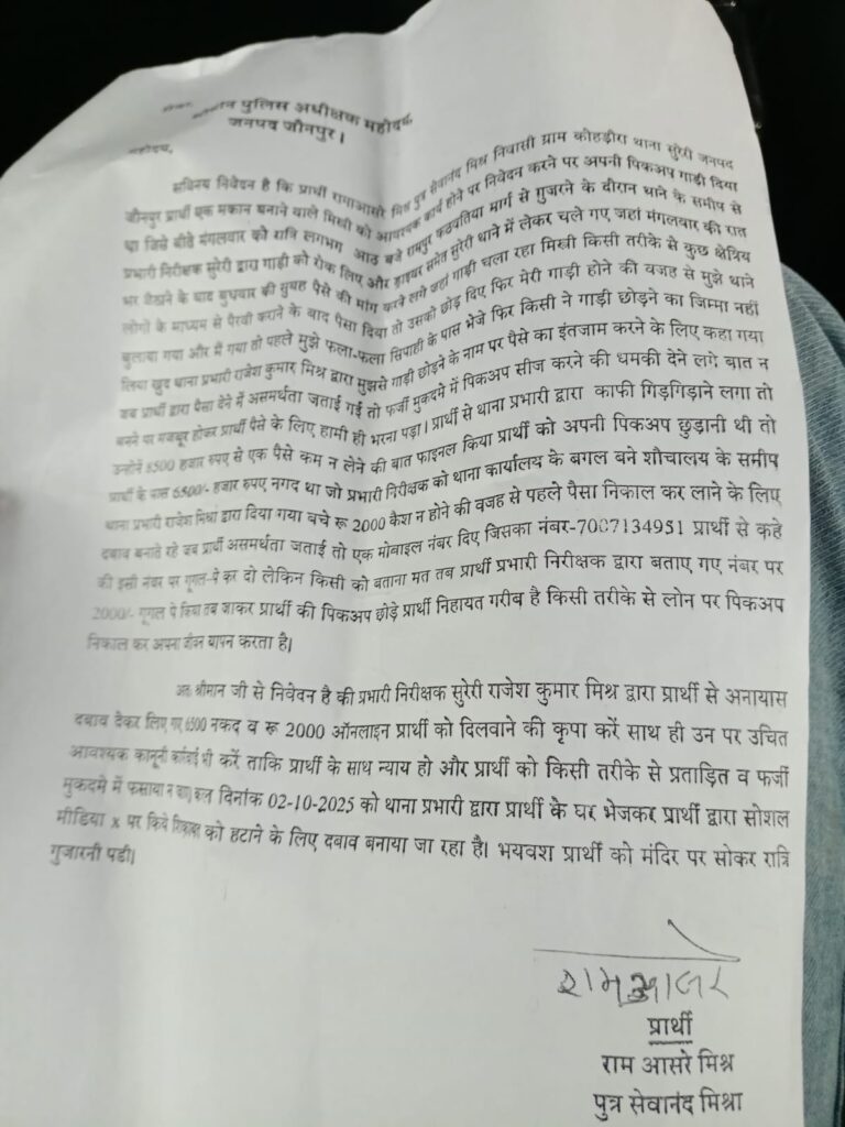सुरेरी, जौनपुर। थाना क्षेत्र के कोहड़ौरा गांव निवासी एक व्यक्ति ने प्रभारी निरीक्षक सुरेरी पर पिकअप वाहन छोड़ने के नाम पर रुपये लेने का गंभीर आरोप लगाया है। पीड़ित ने शुक्रवार को पुलिस अधीक्षक जौनपुर डॉ. कौस्तुभ को प्रार्थना पत्र देकर न्याय की गुहार लगाई है।
