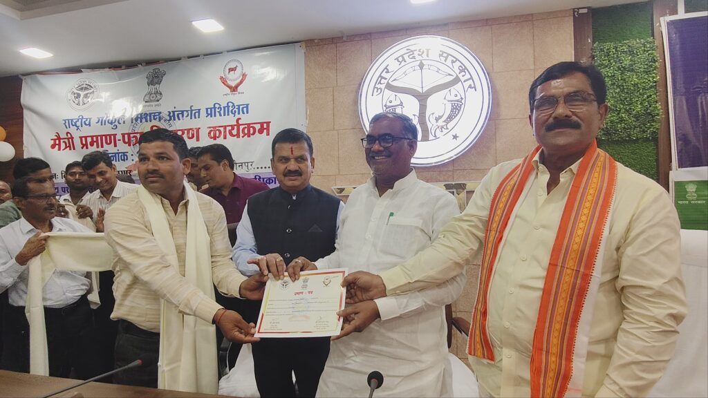 इस अवसर पर राष्ट्रीय गोकुल मिशन योजनान्तर्गत उत्तर प्रदेश पशुधन विकास परिषद लखनऊ द्वारा चयनित 11 उत्कृष्ट पशु मैत्रियों को राज्यमंत्री गिरीश चन्द्र यादव द्वारा प्रमाण पत्र प्रदान किए गए।