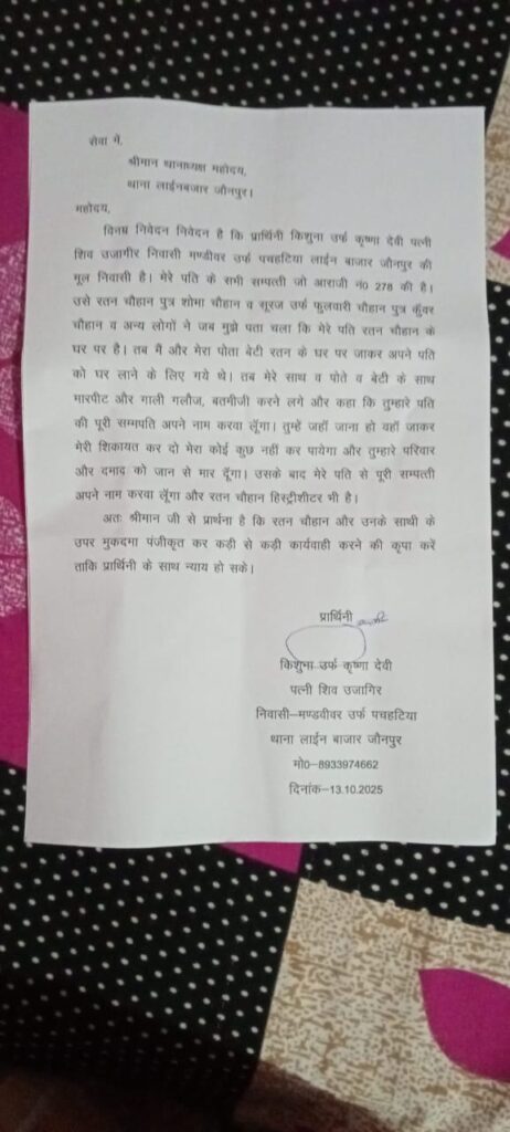 जौनपुर। लाइन बाजार थाना क्षेत्र के मण्डबीवर उर्फ पचहटिया की निवासी किशुना उर्फ कृष्णा देवी पत्नी शिव उजागिर ने पति की संपत्ति हड़काने वाले रतन चौहान जो थाने का हिस्ट्रीशीटर है कब्ज़ा और धोखे से लिखवाने के प्रयास, मारपीट और जान से मारने की धमकी का गंभीर आरोप लगाते हुए पुलिस से न्याय की गुहार लगाई है।