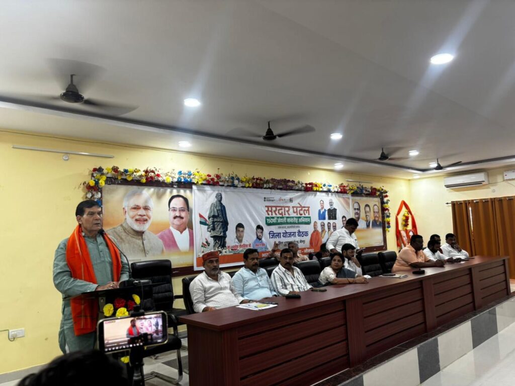 लौह पुरुष सरदार वल्लभभाई पटेल की 150वीं जयंती वर्ष के उपलक्ष्य में तैयारियों को लेकर भारतीय जनता पार्टी के जिला कार्यालय में एक महत्वपूर्ण बैठक आयोजित की गई। बैठक की अध्यक्षता भाजपा जिलाध्यक्ष पुष्पराज सिंह ने की, जबकि मुख्य अतिथि के रूप में प्रदेश के ऊर्जा मंत्री ए.के. शर्मा उपस्थित रहे।