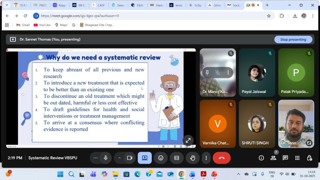जौनपुर। वीर बहादुर सिंह पूर्वांचल विश्वविद्यालय के व्यवहारिक मनोविज्ञान विभाग में शनिवार को स्नातक, परास्नातक, शोधार्थियों एवं पूर्व छात्रों के लिए “सिस्टेमेटिक लिटरेचर रिव्यू (एसएलआर)” विषय पर एकदिवसीय प्रशिक्षण कार्यशाला का आयोजन किया गया। विषय विशेषज्ञ के रूप में विभाग के पूर्व छात्र डॉ. सेनट थॉमस, असिस्टेंट प्रोफेसर, क्लिनिकल साइकोलॉजी, इनापोया विश्वविद्यालय, बेंगलुरु उपस्थित रहे।
