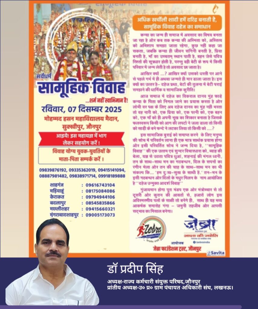 जौनपुर। समाज में दहेज प्रथा जैसी कुरीतियों के उन्मूलन और सादगीपूर्ण विवाह को प्रोत्साहन देने के उद्देश्य से जेब्रा फाउंडेशन ट्रस्ट द्वारा आगामी 7 दिसंबर 2025 को मोहम्मद हसन महाविद्यालय मैदान, सुख्खीपुर (जौनपुर) में नौवें सर्वधर्म सामूहिक विवाह समारोह का आयोजन किया जा रहा है। यह आयोजन एक ही मंडप के नीचे, पूर्णतः गरिमामयी और सरल प्रक्रिया के साथ सम्पन्न होगा।