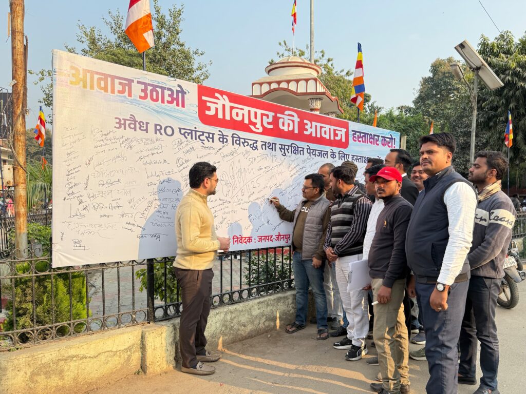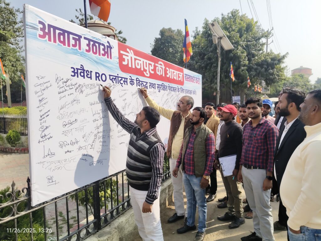 जौनपुर। जिले में चल रहे अवैध आरओ वाटर प्लांट्स के खिलाफ बुधवार को नागरिकों ने ऐतिहासिक एकजुटता दिखाते हुए बड़ी मुहिम चलाई। भूजल दोहन, जहरीले रिजेक्ट वाटर से फैलते प्रदूषण और दूषित पानी से बढ़ रही गंभीर बीमारियों के खिलाफ अम्बेडकर तिराहा, दीवानी न्यायालय परिसर के पास सुबह 10 बजे से शाम 4 बजे तक विशाल हस्ताक्षर अभियान आयोजित किया गया। मात्र छह घंटे में पांच सौ से अधिक लोगों ने अपने हस्ताक्षर कर विरोध दर्ज कराया।