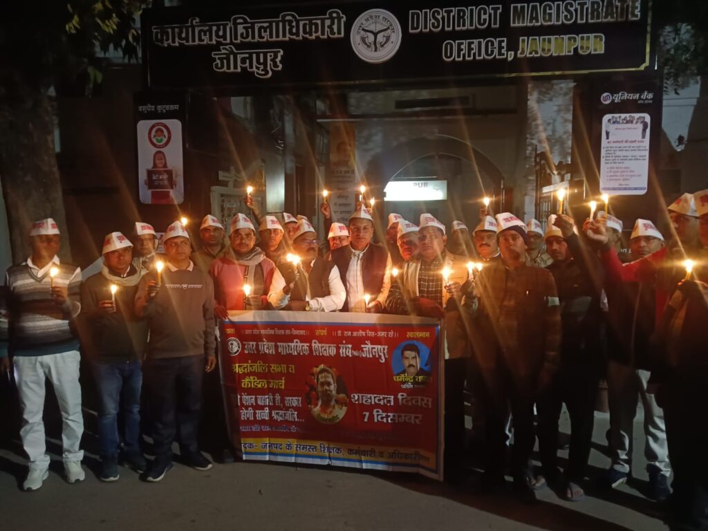 Jaunpur news पुरानी पेंशन बहाली की मांग को लेकर शिक्षक संगठन का कैंडल मार्च, शहीद डॉ. रामाशीष सिंह को दी गई भावपूर्ण श्रद्धांजलि