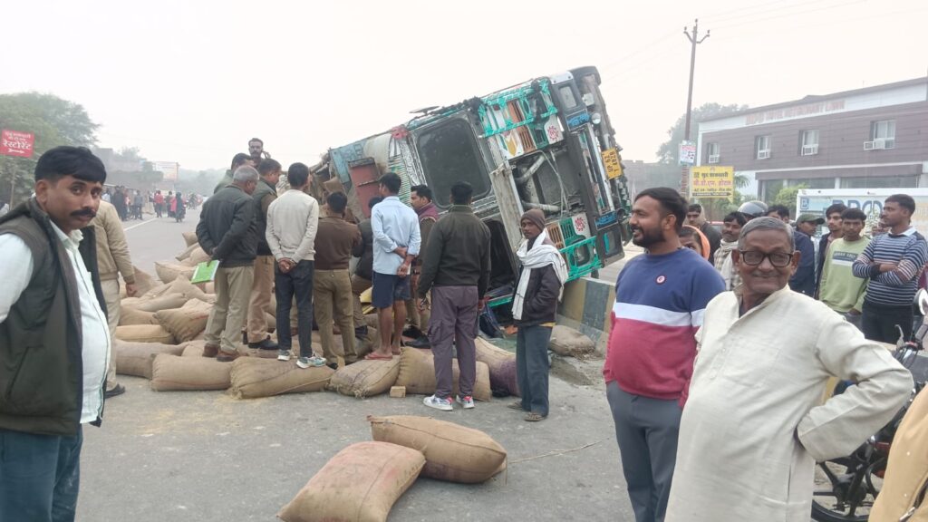 Jaunpur news रोडवेज की रेस में मच गया हाहाकार: बेकाबू ट्रक ने बाइक सवारों को मारी टक्कर, पलटने से हाईवे पर घंटों जाम