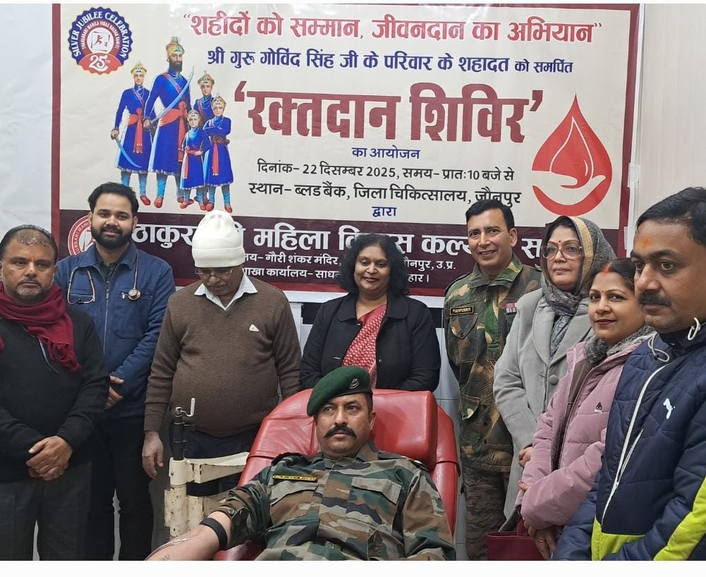 जौनपुर जिले की प्रतिष्ठित सामाजिक संस्था ठाकुरबाड़ी महिला विकास कल्याण समिति सिंगरामऊ द्वारा जिला चिकित्सालय के ब्लड बैंक पर एक रक्तदान शिविर का आयोजन किया गया। संस्था प्रमुख डॉ अंजू सिंह ने बताया कि गुरु गोविंद सिंह जी के पूरे परिवार की शहादत को नमन करते हुए श्रद्धांजलि स्वरूप इस रक्तदान शिविर का आयोजन किया गया है। साथ ही उन्होंने बताया कि संस्था को समाज सेवा से जुड़कर कार्य करते हुए 24 वर्ष पूरे हो चुके हैं और 25वाँ सिल्वर जुबली वर्ष चल रहा है l शिविर का शुभारंभ डॉ. लक्ष्मी सिंह मुख्य चिकित्सा अधिकारी जौनपुर, कीर्ति चक्र से सम्मानित लेफ्टिनेंट कर्नल पुष्पेंद्र सिंह जी एवं सीएमएस के.के राय द्वारा संयुक्त रूप से फीता काटकर किया गया इस अवसर पर लेफ्टिनेंट कर्नल पुष्पेंद्र सिंह जी ने कहा कि गुरु गोविंद सिंह जी के पूरे परिवार ने धर्म और देश की रक्षा के लिए अपनी जान की बाजी लगा दी थी और अब हमारी जिम्मेदारी है कि हम उनके इस बलिदान को याद रखें और समाज के लिए कुछ अच्छा करने का प्रयास करें उन्होंने संस्था प्रमुख डॉ अंजू सिंह के द्वारा शहीदों के सम्मान में चलाये जा रहे रक्तदान अभियान एवं अन्य सामाजिक कार्यों की सराहना की सीएमओ डॉक्टर लक्ष्मी सिंह ने रक्तदान के महत्व को बताते हुए इसे महादान बताया शिविर में 35 लोगों ने रजिस्ट्रेशन कराया जिसमें से 20 लोगों ने रक्तदान किया रक्तदान करने वालों में मुख्य रूप से चंदन तिवारी, प्रवीण कुमार सिंह, सोनम सिंह, आकांक्षा सिंह, मंजू यादव,अखण्ड प्रताप सिंह, सत्यम, निलेश यादव, गौरव पांडे, सूरज कुमार आदि रहे इस अवसर पर ब्लड बैंक के डॉ. प्रतीक सिंह, एच.के कुशवाहा, शालिनी मौर्य, साकेत प्रधान सहित सभी स्टाफ एवं संस्था की तरफ से नेहा सिंह, सद्दाम, तौकीर, मंजू, सौम्या सिंह, सत्यजीत आदि उपस्थित रहे l अंत में संस्था के द्वारा सभी रक्तदानियों को मोमेंटो एवं प्रमाण पत्र वितरित किया गया।