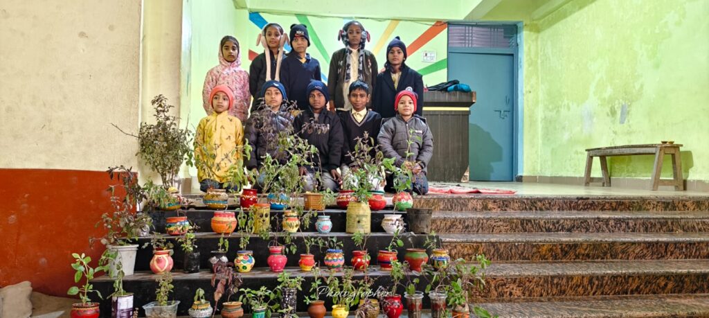 बच्चो और शिक्षकों ने गमले में लगा तुलसी का पौधा किया दान