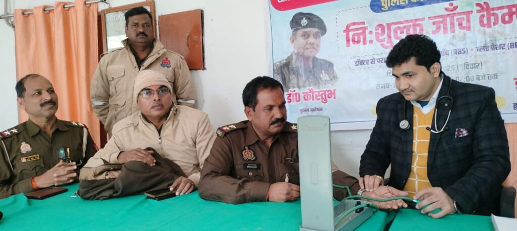 शहर के माँ शारदा हॉस्पिटल के चिकित्सक डॉ विकास उपाध्याय के द्वारा यह निःशुल्क स्वास्थ्य शिविर लगाया गया।शिविर में पुलिस के जवानों का शुगर, बीपी आदि की जांच की गयी।उसके अलावा उन्हें आवश्यक दवाएं भी दिया गया।श्री उपाध्याय ने पुलिस के जवानों को स्वास्थ्य को लेकर कुछ अहम सलाह दिया।उन्होंने जवानों को प्रतिदिन नियमित योगा,कसरत करते रहने की सलाह दिया।इसके अलावा खानपान को लेकर हमेशा सावधानी बरतने की अपील किया।उन्होंने कहा शरीर रोग का घर है।इसे हमे हमेशा बचाकर रखना चाहिए।थोड़ी सी लापरवाही हमे बीमार बना देती है।इस लिए हमेशा जागरूक रहना होगा।शिविर में उनकी टीम में अंकित उपाध्याय थानाध्यक्ष श्रीप्रकाश शुक्ल,अनिल यादव, दीपक उपाध्याय, अनुपम दूबे व करुणा निषाद आदि मौजूद रहे।