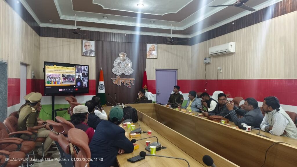 जौनपुर पुलिस लाइन सभागार में वीडियो कॉन्फ्रेंसिंग के माध्यम से आयोजित कार्यक्रम में पुलिस अधीक्षक जौनपुर, क्षेत्राधिकारी सदर तथा जिले के वरिष्ठ पत्रकारगण उपस्थित रहे।