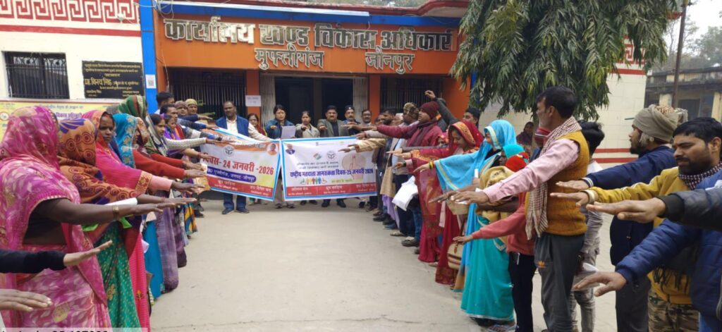 मुख्य निर्वाचन अधिकारी उत्तर प्रदेश एवं उप जिला निर्वाचन अधिकारी जौनपुर के निर्देश के क्रम में शनिवार को विकास खण्ड मुफ्तीगंज जौनपुर में राष्ट्रीय मतदाता जागरूकता दिवस का आयोजन करते हुए कार्यालय के समस्त अधिकारियों कर्मचारियों एवं एसआईआर की नोटिस सुनवाई के लिए उपस्थित भारी संख्या में आम जनमानस को मताधिकार प्रयोग करने के लिए जागरूक किया गया। खण्ड विकास अधिकारी अस्मिता सेन ने सभी लोगों को इस अवसर पर शपथ दिलाया। उपस्थित लोगों को संबोधित करते हुए बीडीओ ने कहा कि मतदान का अधिकार संविधान द्वारा प्रदत्त अधिकार है। अतः राष्ट्र की एकता व संविधान की रक्षा के लिए अपने मत का प्रयोग अवश्य करें।सहायक विकास अधिकारी ग्राम्य विकास फूलचन्द कनौजिया ने सभी लोगों से बिना प्रलोभन से प्रभावित हुए मतदान करने के लिए प्रेरित किया। राष्ट्रीय मतदाता जागरूकता दिवस के इस पवित्र कार्यक्रम में विकास खण्ड में ब्लॉक प्रमुख प्रतिनिधि अजय सिंह, सहायक विकास अधिकारी पंचायत रजनीश पांडेय, सहायक विकास अधिकारी कृषि अशोक कुमार पाल, सहायक विकास अधिकारी सांख्यिकी अरविंद कुमार मौर्य ,वरिष्ठ सहायक चंद्रशेखर गुप्ता, वरिष्ठ सहायक प्रखर अस्थाना, मनरेगा अकाउंटेंट रचित कपूर, लेखाकार दिनेश, रामदत्त ,अनूप दीक्षित, रविशंकर ,सुरेश चंद्र ,आलोक सिंह, धर्मराज, संजय मौर्य, संजय यादव, रमेश चंद्र एवं भारी संख्या में आम जनमानस उपस्थित रहे।