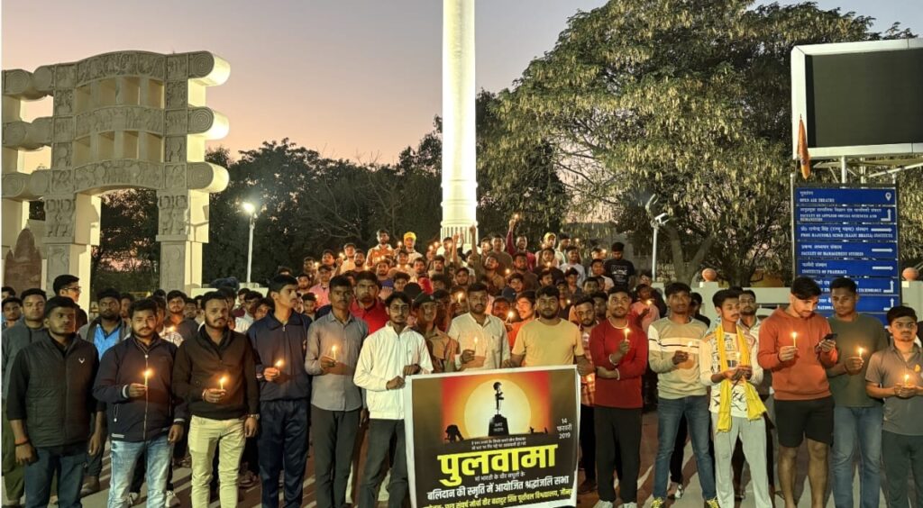 पुलवामा शहीदों को विश्वविद्यालय की छात्र छात्राओं ने मोमबत्ती जलाकर दी श्रद्धांजलि