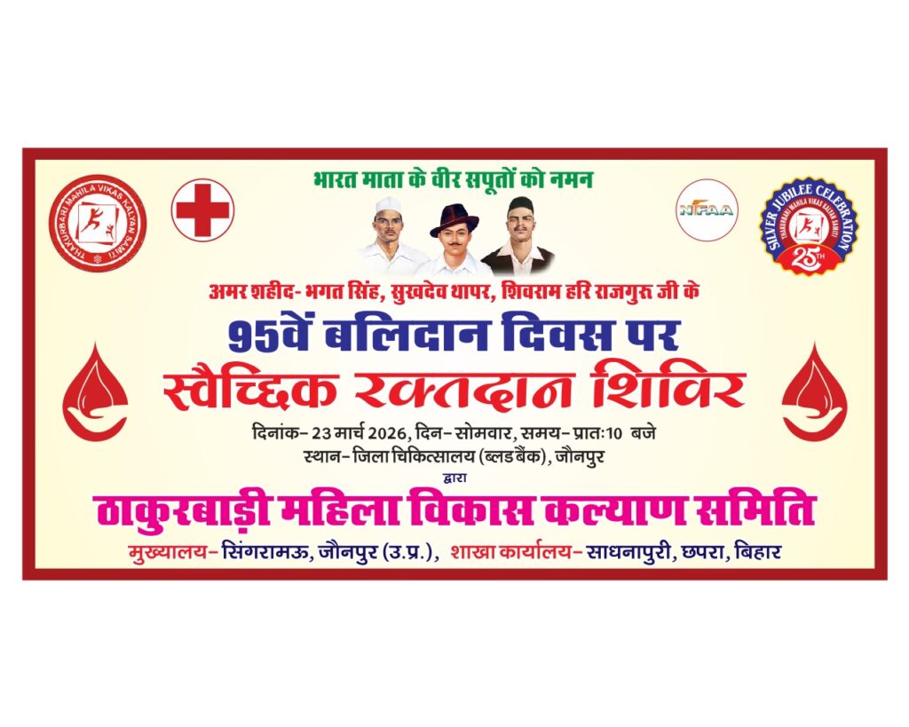 जौनपुर । ठाकुर बाड़ी महिला विकास कल्याण समिति, सिंगरामऊ के तत्वावधान में कल, 23 मार्च (सोमवार) को अमर शहीद भगत सिंह, सुखदेव और राजगुरु के 95वें बलिदान दिवस पर एक स्वैच्छिक रक्तदान शिविर का आयोजन किया जाएगा।
