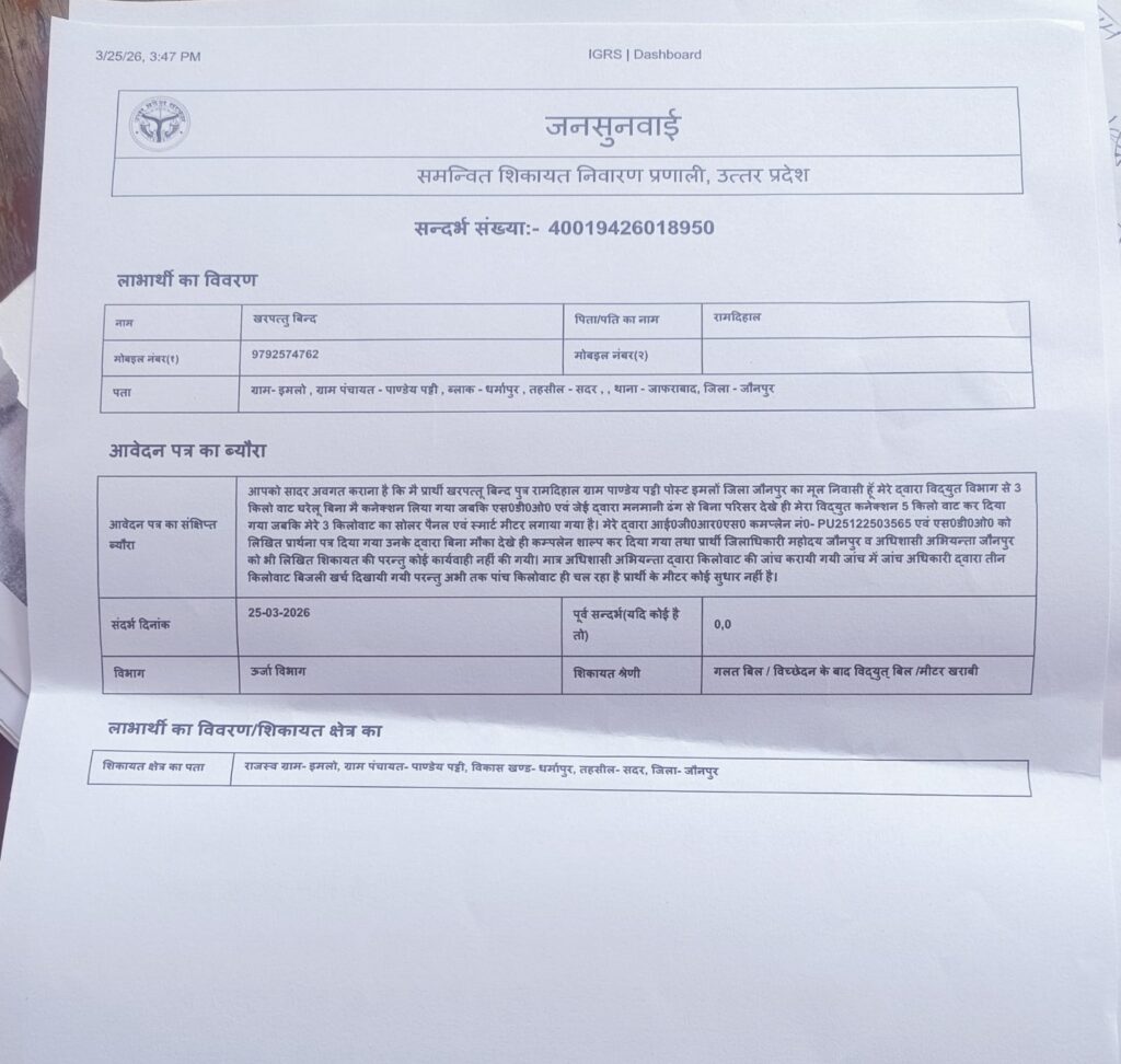 ग्राम पाण्डेय पट्टी निवासी खरपत्तू बिन्द पुत्र रामदिहाल ने मुख्यमंत्री को भेजे शिकायती पत्र में बताया कि उन्होंने विद्युत विभाग से 3 किलोवाट का घरेलू कनेक्शन लिया था। उनके घर पर 3 किलोवाट का सोलर पैनल और स्मार्ट मीटर भी लगा हुआ है। आरोप है कि इसके बावजूद एसडीओ और जेई ने बिना परिसर का निरीक्षण किए ही मनमाने ढंग से उनके कनेक्शन को 3 किलोवाट से बढ़ाकर 5 किलोवाट कर दिया। पीड़ित ने इस संबंध में आईजीआरएस पोर्टल (शिकायत संख्या- PU25122503565) पर शिकायत दर्ज कराई और संबंधित अधिकारियों को लिखित पत्र भी दिया, लेकिन बिना मौका मुआयना किए ही शिकायत का निस्तारण कर दिया गया।