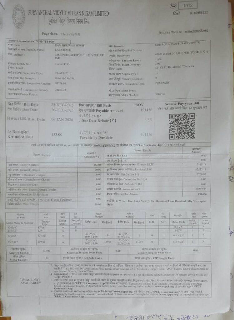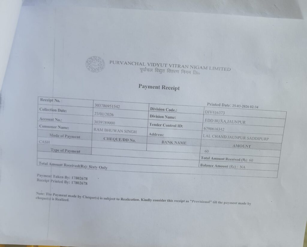 सिद्दीकपुर निवासी एक उपभोक्ता राम भुवन सिंह के खाता संख्या 3039789000 पर उनका पिछले कई वर्षों से एक लाख 91हजार 456 बिल बकाया था। इसके बाद सरकार की तरफ से चलाए जा रहे विद्युत बिल माफी योजना 2025 के तहत छूट काटने के बाद उपभोक्ता को कुल 82195 जमा करना था। जिसके लिए उपभोक्ता ने इस योजना का लाभ लेने के लिए 30 दिसंबर 2025 को दो हजार रूपए जमा करके रजिस्ट्रेशन कराया। जिसकी रसिद संख्या 303433 71 6314 है। रजिस्ट्रेशन करने के बाद उपभोक्ता को एक अधिकारी द्वारा प्रलोभन दिया गया कि वह हमारे ऑफिस में सीधे आए , और छूट दिया जाएगा इसके एवज में उसे 60 हजार अलग से देने होंगे। अवैध शुल्क लेकर उसका विद्युत कनेक्शन पीडी (अस्थाई विच्छेदन) कर दिया गया और उसे 60 रूपये की रसीद उपभोक्ता को पकड़ा दी गई। इसके बाद रामभुवन सिंह के नाम से ही बिना किसी जांच पड़ताल के नया कनेक्शन दे दिया गया। जिसका खाता संख्या 0649921064 है। जिससे विद्युत राजस्व में भारी हेरा फेरी की गई। बता दे मल्हनी आदमपुर पावर हाउस के अंतर्गत एक दर्जन से अधिक पीडी व शिफ्टिंग कर दिए गए । जिसमें भी हेरा फेरी हुई है। इस तरह बिजली विभाग के मिली भगत से काफी बिल में भारी हेरा फेरी किया गया है। मामले की जांच कराई जाए तो और खुलासे होंगे।