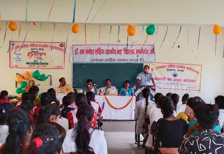 मुफ्तीगंज राम मनोहर लोहिया राजकीय महाविद्यालय मुफ्तीगंज के प्रांगण में आज आजादी का अमृत महोत्सव एवं मिशन शक्ति के संयुक्त तत्वाधान में शहीदी दिवस पर 1857 की क्रांति में वीरांगना रानी लक्ष्मीबाई की भूमिका विषय पर व्याख्यान माला का किया गया आयोजन जिसमें मुख्य अतिथि के रुप में सामुदायिक स्वास्थ्य केंद्र मुफ्तीगंज के प्रभारी डॉक्टर श्रवण कुमार यादव विशिष्ट अतिथि समाजसेवी मनोज राय व महाविद्यालय के प्राचार्य डॉ जयप्रकाश पाठक,प्राध्यापक डॉ अजीत कुमार मिश्र व डॉक्टर प्रतिमा सिंह की मौजूदगी मे कार्यक्रम का शुरुआत मां सरस्वती की प्रतिमा के सामने दीप प्रज्वलित कर माल्यार्पण कर किया गया जिसके बाद डॉक्टर अजीत कुमार मिश्र द्वारा 1857 की क्रांति वीरांगना रानी लक्ष्मीबाई की भूमिका के विषय में विस्तृत जानकारी छात्र छात्राओं को दी गई मुख्य अतिथि डॉ श्रवण कुमार यादव ने छात्र-छात्राओं को संबोधित किया तथा स्वास्थ्य के विषय में जानकारी देते हुए लोगों को सचेत रहने के बारे में बताएं कार्यक्रम का संचालन कर रही मिशन शक्ति एवं अमृत महोत्सव की नोडल अधिकारी डॉक्टर प्रतिमा सिंह ने किया कार्यक्रम का समापन प्राचार्य द्वारा सभी को धन्यवाद ज्ञापित कर किया गया इस मौके पर महाविद्यालय परिसर के कर्मचारी मंगला प्रसाद यादव अजय सिंह मनोज कुमार अखिलेश तथा परीक्षा अजीत कुमार आदि उपस्थित रहे