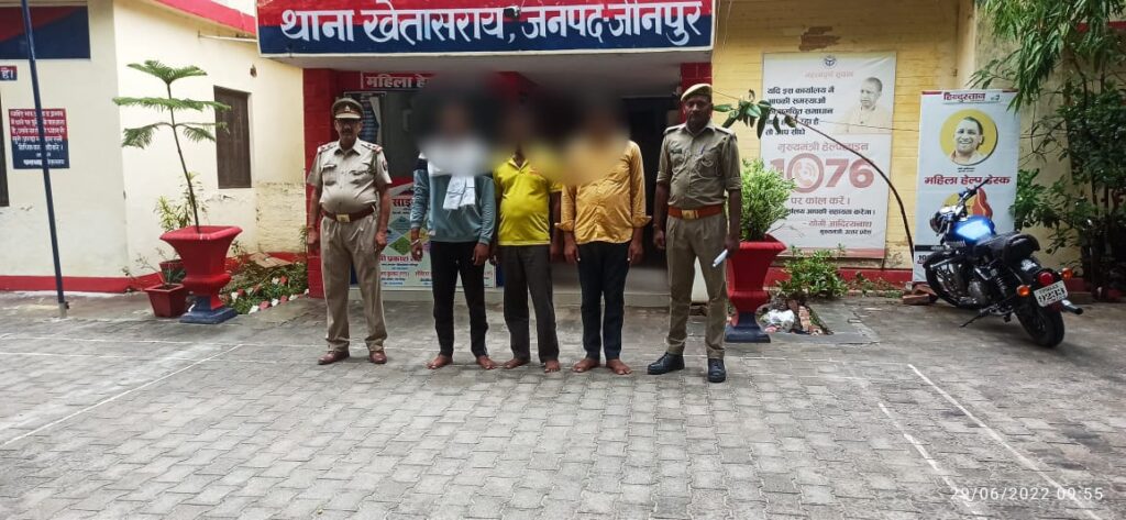 अजय साहनी, वरिष्ठ पुलिस अधीक्षक जनपद जौनपुर के कुशल निर्देशन मे अपराध एवं अपराधियों तथा वाँछित अपराधियों की गिरफ्तारी हेतु चलाये गये विशेष अभियान के तहत अपर पुलिस अधीक्षक नगर डा0 संजय कुमार सिंह एवं क्षेत्राधिकारी शाहगंज श्री अंकित कुमार के पर्यवेक्षण एवं दिशा निर्देशन में थाना खेता सराय पुलिस द्वारा थाना खुटहन पर पंजीकृत मु0अ0सं0 103/2022 धारा 3(1) गैंगेस्टर एक्ट मे वांछित अभियुक्त गण 1. सचिन उपाध्याय पुत्र विनोद उपाध्याय निवासी कोकना पिलकिछा थाना खुटहन जनपद जौनपुर 2. शनि तिवारी पुत्र स्व0 अजय तिवारी निवासी नकवी पिलकिछा थाना खुटहन जनपद जौनपुर 3.अमित उपाध्याय उर्फ डिटटू पुत्र महेंद्र उपाध्याय निवासी नकवी पिलकिछा थाना खुटहन जनपद जौनपुर को आज दिनांक 29.06.2022 को कलापुर मोड़ से गिरफ्तार कर चालान सम्बंधित माननीय न्यायालय किया गया ।