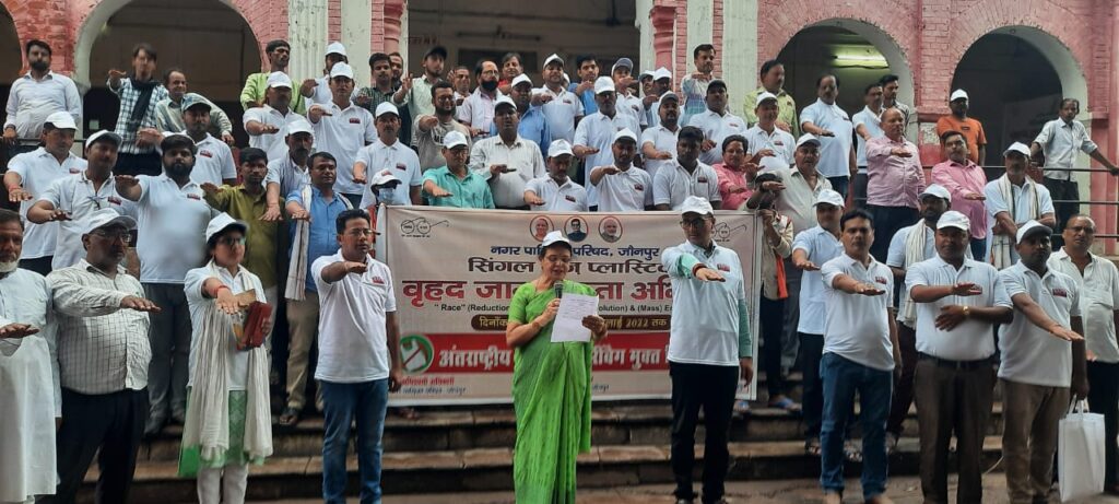 जिला प्रशासन जिला अधिकारी जी के नेतृत्व में नगरपालिका प्रांगण में आयोजित कार्यक्रम सिंगल यूज़ प्लास्टिक बृहद जागरूकता अभियान का शुभारंभ नगर पालिका अध्यक्ष माया टंडन ने फीता काटकर किया इस अवसर पर माया टंडन ने अपने उद्बोधन में लोगों से अपील की है उन्होंने कहा हमारे जौनपुर के लोग अगर पॉलिथीन इस्तेमाल करना बंद कर दे तो वातावरण प्रदूषित ना हो नालियों में जो पॉलिथीन फसती है उसकी वजह से नाली का पानी सड़क पर आता है जिससे आम जनमानस को समस्याओं का सामना करना पड़ता है कर्मचारियों के सफाई करने के बाद भी पॉलिथीन की वजह से नाली कहीं-कहीं भरी दिखती है और बरसात में काफी समस्याओं का सामना करना पड़ता है ऐसे में सभी दुकानदारों से घर की महिलाओं पुरुष से अपील है कि पॉलिथीन को एकदम बंद करके कागज और कपड़े के झूले का इस्तेमाल करें इस अवसर पर अधिशासी अधिकारी संतोष कुमार मिश्रा ने जनता से अपील की है नगर को साफ बनाए रखने में जनता का सहयोग की बेहद आवश्यकता है कूड़ा समय से कूड़ेदान में डालें सफाई हो जाने के बाद कूड़े को सड़क पर ना फेंके कार्यक्रम का संचालन सलमान शेख ने किया आभार डीपीएम अमित यादव ने किया इस अवसर पर अधिशासी अभियंता उमेश कुमार एसबीएम खुशबू यादव सफाई निरीक्षक हरिश्चंद्र यादव जेई दीपक शाह कृष्ण मोहन प्रजापति ओ यस अनिल यादव समाजसेवी रजत समाजसेवी अवधेश यादव जी वैज्ञानिक कृष्ण कुमार जी आदि गणमान्य लोग उपस्थित रहे