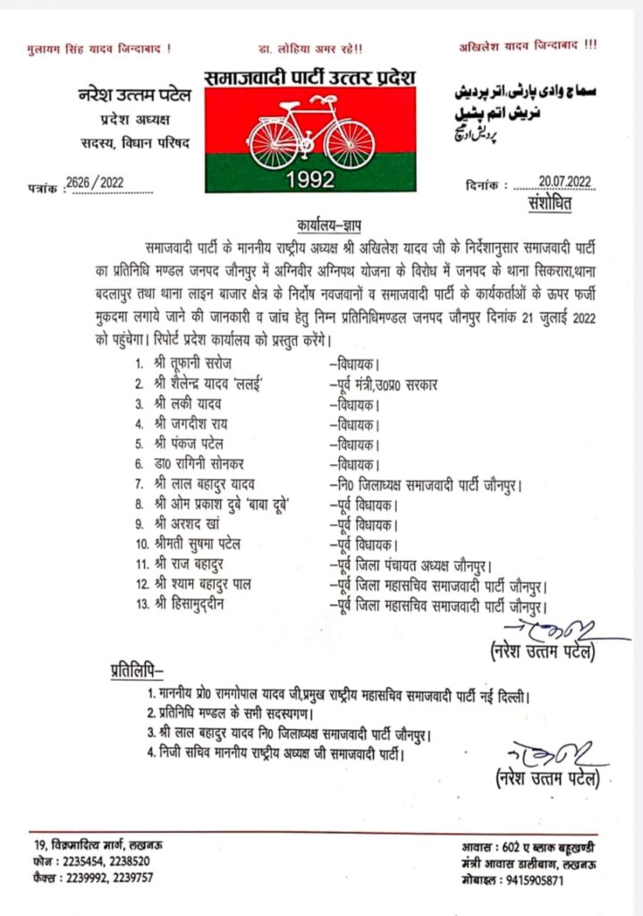 समाजवादी पार्टी के राष्ट्रीय अध्यक्ष अखिलेश यादव के निर्देशानुसार समाजवादी पार्टी का एक प्रतिनिधिमंडल कल दिनांक 21 जुलाई 11:30 बजे स्थानीय लोक निर्माण विभाग के डाक बंगले में अग्नीपथ योजना का विरोध कर रहे अग्नि वीरों पर थाना सिकरारा, बदलापुर एवं लाइन बाज़ार में दर्ज फर्जी मुकदमों के बारे में विस्तृत जानकारी हासिल करेगा। उक्त अवसर पर ऐसे अग्नि वीरों और समाजवादी पार्टी के कार्यकर्ताओं पर दुर्भावनावश फर्जी मुकदमे लगाया गए है सभी लोग लोक निर्माण विभाग डाक बंगले में सपा के प्रतिनिधिमंडल से मिलकर अपना पक्ष रखेंगे ऐसे लोग जिनके खिलाफ हुए हैं समाजवादी पार्टी उनके साथ खड़ी है और उनकी लड़ाई लड़ने के लिए तैयार उक्त बातें निवर्तमान जिला अध्यक्ष लाल बहादुर यादव ने कही है।