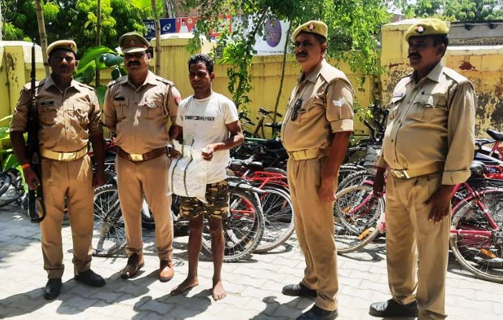 अजय साहनी वरिष्ठ पुलिस अधीक्षक जौनपुर के निर्देशन में अवैध मादक पदार्थों की बरामदगी एवं संलिप्त लोगों की गिरफ्तारी हेतु चलाये जा रहे विशेष अभियान के क्रम में अपर पुलिस अधीक्षक नगर व क्षेत्राधिकारी नगर जौनपुर के दिशा निर्देशन व पर्यवेक्षण में प्रभारी निरीक्षक लाइनबाजार के नेतृत्व में उ0नि0 आशुतोष कुमार गुप्ता मय हमराह द्वारा गस्त के दौरान आज सुबह गुलाबी देवी क्रासिंग कन्हईपुर पर मौजूद थे कि एक व्यक्ति भूपतपट्टी की तरफ से पैदल साइकिल लेकर आ रहा था कि पुलिस वालों को देखकर पीछे मुड़कर जाने लगा । शक होने पर पुलिस बल के लोगो ने रूकने को कहां तो तेज कदमो से जाने लगा कि हमराही पुलिस बल की मदद से 50-60 कदम जाते-जाते पकड़ लिया गया। पकड़े गये व्यक्ति का नाम , पता पूछा गया तो उसने अपना नाम श्रवण कुमार गौतम उर्फ चुल्ली पुत्र स्व0 छोटेलाल गौतम निवासी भूपतपट्टी थाना- लाईन बाजार जनपद- जौनपुर उम्र करीब 23 वर्ष बताया । पकड़े गये व्यक्ति की जामा तलाशी ली गयी तो साइकिल में टंगे सफेद प्लास्टिक के झोले में एक पालिथिन में अखबार में लिपटा 1 किलो 100 ग्राम गांजा बरामद हुआ और अभियुक्त के निशानदेही पर चोरी की 35 साइकिल बरामद हुई।