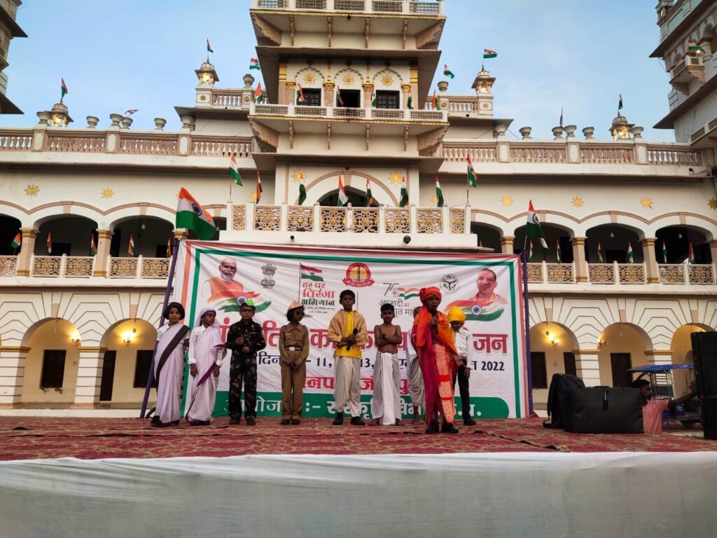 – आजादी के अमृत महोत्सव के अवसर पर 11 से 17 अगस्त 2022 तक स्वतंत्रता सप्ताह”, 11 अगस्त 2022 से 15 अगस्त 2022 तक “सांस्कृतिक कार्यक्रम” एवं 13 से 15 अगस्त 2022 तक “हर घर तिरंगा कार्यक्रम” तथा 14 अगस्त 2022 को “विभाजन विभीषिका स्मृति दिवस” मनाये जाने के निर्देश दिये गये है, जिसके अन्तर्गत आजादी के अमृत महोत्सव के अवसर पर सांस्कृतिक कार्यक्रम के आयोजन शासन द्वारा जनपद के विभिन्न स्थलों को चिन्हित करते हुए कराया जा रहा है जिसके क्रम में राजमहल, खासनपुर में सांस्कृतिक कार्यक्रम का आयोजन किया गया । कार्यक्रम का शुभारंभ जिला विकास अधिकारी बी.बी सिंह, बेसिक शिक्षा अधिकारी गोरखनाथ पटेल, जिला अर्थ एवं संख्या अधिकारी आर डी यादव एवं समाजसेवी विनीत सेठ के द्वारा दीप प्रज्वलन कर किया गया ।कार्यक्रम में गायक राहुल पाठक एवं उनकी टीम के द्वारा अपनी प्रस्तुति की गई। उच्च माध्यमिक विद्यालय गुरैनी, प्राथमिक विद्यालय कुल्हनामउ खास, प्राथमिक विद्यालय चकताली सिरकोनी , उच्च पूर्व माध्यमिक विद्यालय गुरैनी के द्वारा सांस्कृतिक कार्यक्रम प्रस्तुत किया गया । कार्यक्रम का संचालन एआरपी सिकरारा शैलेश कुमार चतुर्वेदी, निपुण श्रीवास्तव, के द्वारा किया गया।