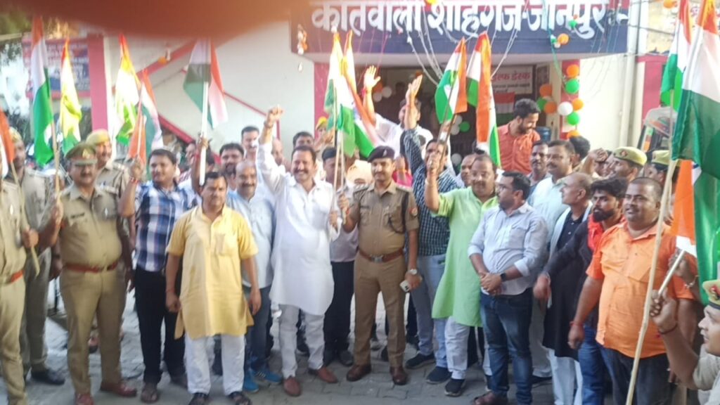 शाहगंज कस्बे में स्वतंत्रता दिवस के दूसरे दिन मंगलवार को पुलिस और संभ्रांत नागरिकों ने मिलकर भव्य तिरंगा यात्रा निकाली । यात्रा में शामिल पुलिस के जवानों और अन्य लोगों ने देशभक्ति भरे नारे लगाए और भारत माता के जयकारों से फिजा गूंज उठी । कोतवाली परिसर से पुलिस के सैकड़ों जवानों, कस्बे के भाजपा नेताओं और संभ्रांत नागरिकों का जत्था जुलूस की शक्ल में नगर भ्रमण को निकल पड़ा । सबके हाथ में तिरंगा झंडा और होठों पर आजादी के परवानों का नारा वंदे मातरम था । यह यात्रा कोतवाली परिसर से निकलकर मुख्य मार्ग, जेसीज चौक, आजमगढ़ रोड, विवेकानंद तिराहा, पुरानी बाज़ार और घासमंडी चौक होते हुए वापस कोतवाली आकर संपन्न हुई । जुलूस की अगुवाई क्षेत्राधिकारी अंकित कुमार ने की । इसके अलावा प्रभारी निरीक्षक सुधीर कुमार आर्या, भाजपा के मल्हनी प्रभारी सतीश सिंह, अनिल मोदनवाल, भाजपा मंडल अध्यक्ष सुनील कुमार टप्पू, चेयरमैन प्रतिनिधि प्रदीप जायसवाल, ईशान राम जायसवाल, रूपेश जायसवाल, भुवनेश्वर मोदनवाल, विशाल जायसवाल, गुलाम साबिर, अतुल गुप्ता, नितिन साहू और अक्षत अग्रहरि आदि मौजूद रहे ।