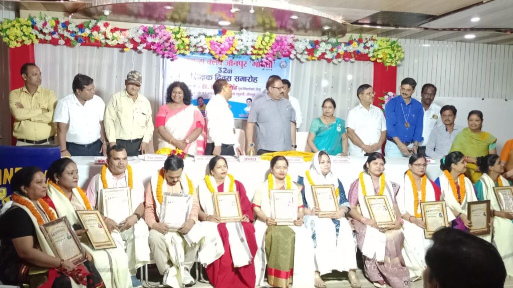 । जौनपुर: लायंस क्लब गोमती जौनपुर द्वारा पूर्व राष्ट्रपति डॉक्टर सर्वपल्ली राधाकृष्णन के जन्मदिवस के अवसर पर सोमवार देर शाम एक होटल के सभागार में 32वा शिक्षक दिवस समारोह बड़े हर्षोल्लास के साथ मनाया गया। कार्यक्रम का शुभारंभ अध्यक्ष देवेश गुप्ता के व्दारा सभा प्रारंभ की घोषणा के साथ हुआ। तत्पश्चात उपस्थित सभी अतिथियों के द्वारा सर्वपल्ली जी के चित्र पर माल्यार्पण कर व ज्योति प्रज्ज्वलन किया गया। इसी क्रम में सभी अतिथियों का माल्यार्पण कर व क्लब की प्रथम महिला निधि गुप्ता के द्वारा उन्हें पुष्पगुच्छ प्रदान कर स्वागत किया गया। तत्पश्चात डॉक्टर रश्मि मौर्य के द्वारा ध्वजवंदना व राष्ट्र गान प्रस्तुत किया। साथ ही साथ शान्वी मौर्या ने गुरु वंदना पर भावपूर्ण नृत्य प्रस्तुत किया। सभा की अध्यक्षता कर रहे हैं क्लब अध्यक्ष देवेश गुप्ता ने आए हुए अतिथियों का स्वागत व अभिनंदन करते हुए अपने उद्बोधन में कहा कि यह क्लब की बड़ी पुनीत परंपरा है की प्रत्येक वर्ष क्लब के द्वारा समाज को दिशा दशा दिखाने वाले हैं हम अपने गुरुजनों का आज दिन विशेष पर सम्मान व अभिनंदन करते हैं। कार्यक्रम में आगे संयोजक दीपक चिटकारीया ने श्रद्धेय सर्वपल्ली जी के जीवन पर प्रकाश डाला और उनके आदर्शों पर चलने की बात की। तत्पश्चात सम्मानित होने वाले सभी शिक्षक गण का जीवन परिचय व शिक्षा जगत में उनके योगदान को सदन में प्रस्तुत किया गया उसके पश्चात कार्यक्रम की मुख्य अतिथि मुख्य चिकित्सा अधिकारी डा. लक्ष्मी सिंह व विशिष्ट अतिथि डा.क्षितिज शर्मा द्वारा सम्मानित होने वाले शिक्षक गण राकेश सिंह, अजय सिंह, डॉ. सरला, डॉ. निरुपमा गुप्ता, श्रीमती किरण श्रीवास्तव, श्रीमती प्रतिमा गुप्ता, डॉ. तस्नीम फातमा, श्रीमती अर्चना गौड, श्रीमती चेतना साहनी, श्रीमती नूपुर सिंह, व श्रीमती प्रज्ञा जी को रीजन चेयरपर्सन अशोक मौर्य व जोन चेयरपर्सन प्रतिमा गुप्ता के उपस्थिति में सभी शिक्षक गणों को माल्यार्पण कर व अंगवस्त्रम एवं प्रशस्ति प्रदान कर सम्मानित किया गया। उक्त अवसर पे मुख्य अतिथि डा. लक्ष्मी सिंह जी ने कहां की शिक्षक समाज का दर्पण होता है जो अपने ज्ञान व विज्ञान से नौनिहालों को सिचता है जो समय-समय पर शिक्षक द्वारा बताए गए रास्ते पर चलकर राष्ट्र निर्माण में अपना महत्वपूर्ण योगदान देते हैं। इसी क्रम में विशिष्ट अतिथि डा. क्षितिज शर्मा ने अपने उद्बोधन में कहा कि हमें अपने जीवन में उन प्रत्येक शिक्षकों को याद रखना चाहिए जिन्होंने हमारे जीवन को अपने शिक्षा व ज्ञान के भंडार से बदल दिया। कार्यक्रम में सम्मानित होने वाले शिक्षक राकेश सिंह, डॉ. तस्नीम फातमा व अजय सिंह ने अपनी बात सदन में रखी। कार्यक्रम को सफल बनाने में डा. राजे
