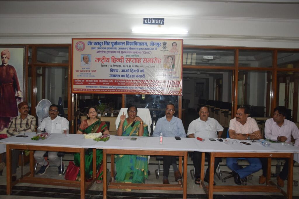 जौनपुर। वीर बहादुर सिंह पूर्वांचल विश्वविद्यालय के विवेकानंद केंद्रीय पुस्तकालय में बुधवार को हिंदी दिवस के अवसर पर संगोष्ठी का आयोजन किया गया. विश्वविद्यालय २० सितम्बर तक राष्ट्रीय हिंदी सप्ताह समारोह का मना रहा है. इसमें विविध कार्यक्रम आयोजित होंगे.
