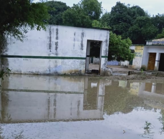 जानकारी के अनुसार बुधवार दोपहर बाद से शुरू तेज बारिश पूरी रात तक चलती रही जिससे तालाब के किनारे स्थित उक्त विद्यालय पानी से घिर गया। गुरुवार को सबेरे बारिश बन्द होने पर जब बच्चे पढ़ाई के लिए पहुंचे तो चारो तरफ पानी देख उल्टे पांव घर वापस हो गए। विद्यालय की प्रभारी प्रधानाध्यापक रीता पाण्डे किसी तरह पानी से होकर विद्यालय भवन तक पहुँची और निर्धारित समय तक विद्यालय पर रुकी रहीं।उन्होंने फोन पर संकुल शिक्षक सुनील सिंह को विद्यालय की समस्या के बारे में बताया। संकुल शिक्षक ने बीईओ को सूचित किया है।
